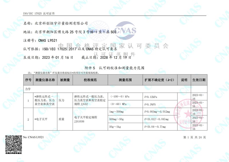 北京科创恒宇计量检测有限公司位于中国的首都、政治、文化中心北京,位于北京市朝阳区博大路25号院3号楼-1至1层S03,于2016年2月25日在北京市朝阳区市场监督管理局注册成立,注册资本为550(万元),是一家致力于为多领域提供计量、校准等服务的公正性检测机构。科创恒宇有完善的质量体系和优秀的技术服务团队,良好的服务意识,公正认真严谨的工作态度,为客户提供一站式专业服务。北京科创恒宇计量检测有限公...